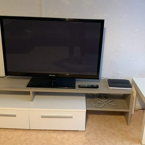 Säljer Mediabänk Memphis, VIT,HGL,LED-belysning med 3 lådor och 3 fack B/H/D cm 174.8/47.5/48,5cm - 1500 kr