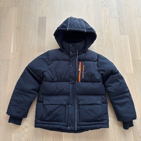 Polarn O. Pyret jacka för barn, unisexmodell i storlek 140. Jackan är grön och tillverkad i polyester. Avtagbar huva och dragkedja framtill med skyddande knappslå. Reflexer på ärmar och framfickor för ökad synlighet. Fickor med dragkedja och mjukt foder på insidan av kragen. Passar som ytterjacka för barn i storlek 140.