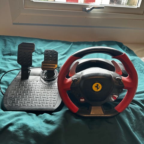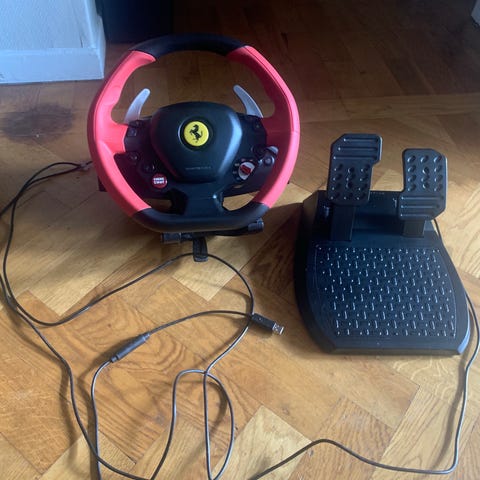Thrustmaster Ferrari racerratt med pedaler i svart och röd färg. Ratten har flera knappar för styrning och inställningar samt kablar för anslutning till spelkonsol eller dator. Pedalenheten har gas- och bromspedal monterade på en gemensam basplatta. Utrustningen är avsedd för bilspel och racingspel där ratt och pedaler används som styrkontroller.