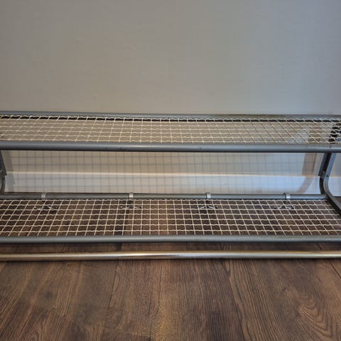 Är i gråsvart metall och i gott skick. Lite avskav efter galgar men inget som syns. Kan säkert användas som skohylla också.