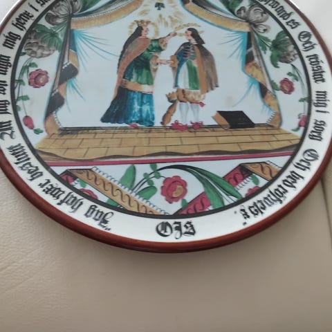 Rörstrand väggtallrikar i blåvitt porslin. Carl Larsson-motiv. Detaljerade illustrationer i mitten och dekorativ bård runt kanten. Tallrikarna har upphängningsanordning på baksidan och är avsedda som prydnadstallrikar för vägg. Baksidan är stämplad med Rörstrands logotyp och information om serien. Mors dag 1971-1988 (spricka 1977). Fars dag 1971-1987 (spricka 1975). Diameter 21 cm.