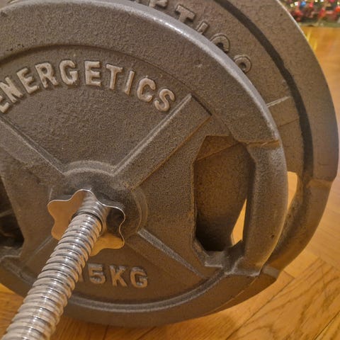 De vikter och träningsredskap på bilderna är vad som ingår.