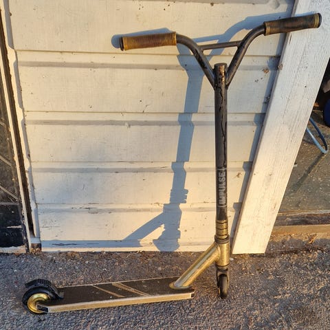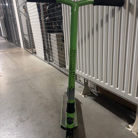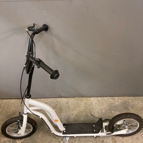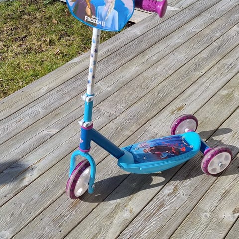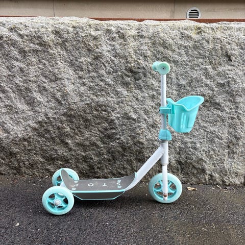 Sparkcykel i trehjulig modell i turkos färg. Utrustad med två bakhjul och ett framhjul för extra stabilitet. Har en ståplatta med halkskydd samt ett handtag framtill med korg för förvaring av mindre saker. Lämplig för mindre barn som vill öva balans och motorik utomhus.