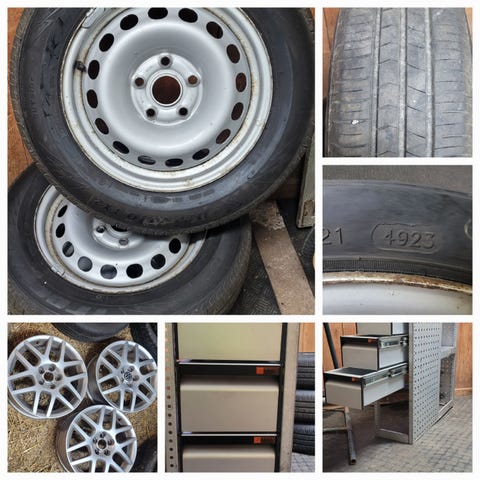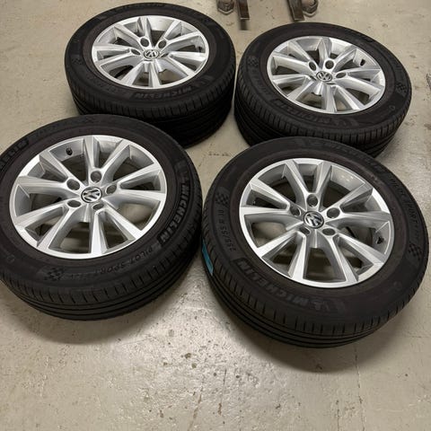 Däck o fälg!Suttit på VW Caddy 2012(Originalfälgar)En centrumkåpa saknas tyvärr,men fälgar i bra skick o däcken är godkända.lite skitiga o skickas ej!Finns i Forshaga (Värmland)