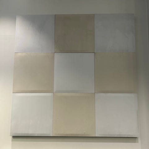 Snygg tavla i färgerna vit, beige, guld och brun.
