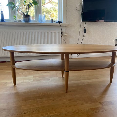 Ovalt soffbord i ek med måtten 160 långt, 70 cm brett och höjd 52 cm. Bordet är köpt på Stalands och heter Madrid till priset 8490 kr. Bordet är i nyskick och säljes på grund av flytt till ny bostad.
