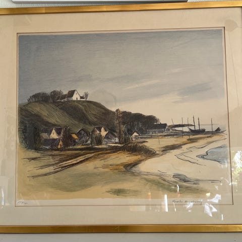 Färglitografi med titeln "Fiskaregatan, Råå" av den svenske konstnären Georg Crona. Ramens mått: 43x52