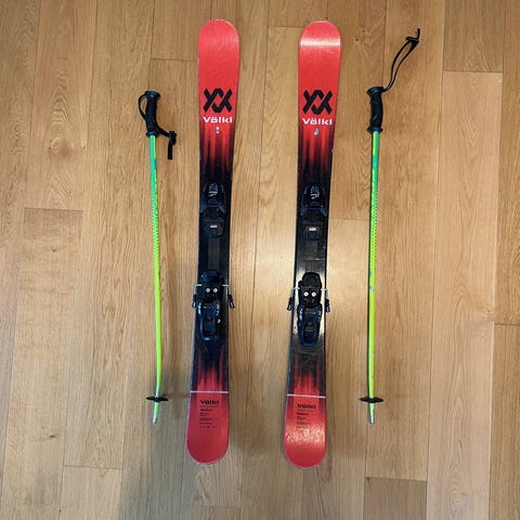 Hej, jag säljer ett par völkl skidor som är twintip. De är 158cm långa och jag har uppskattat skidorna under den perioden jag använt dem. Skidorna har små repor och hack, men inget som påverkat skidåkningen.