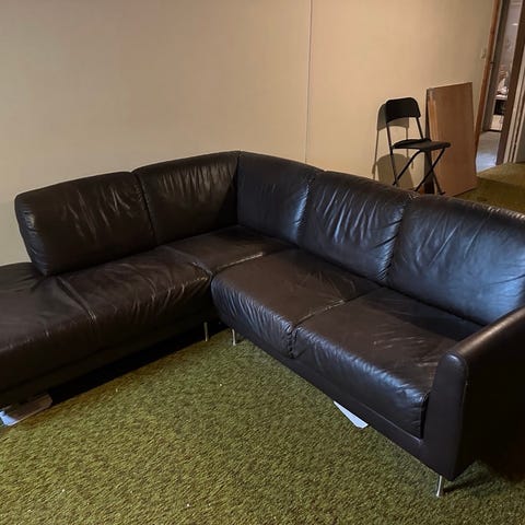 Fotpall/sittpuff i skinn "Arild" från ikea, stomme i metall med dyna i skinn. Brukslitage.