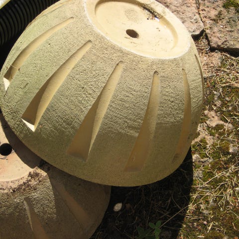 Okänt märke äggformade krukor i grå betong. Krukorna har ojämn, taggig kant som liknar ett kläckt äggskal. Flera storlekar syns på bilden, både öppna krukor och hela äggformade dekorationer. Passar som ytterkrukor eller dekoration inomhus, 350kr styck, finns i Åhus, obs betongäggen är inte till salu