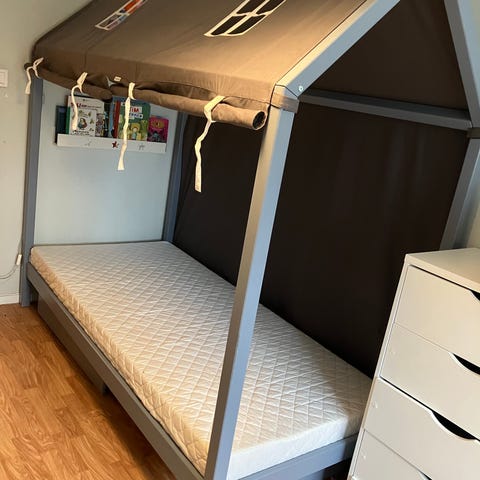 Nu har vår dotter växt ur sin första säng som hon älskat. Både sängramen (Minitude Nordic hussäng 80x200 cm) och madrassen är i gott skick. Perfekt som första säng då barnet lätt kan rulla ut ur sängen och inte riskera slå sig. Vår dotter har haft sängen sedan hon var 2 och är nu 8 år. Allt köpt nytt.