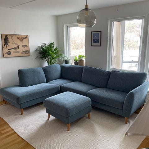 280 cm bredd, divan 182 cm sittbredd 240 cm. Skön soffa med sammet och silver nitar. Köpt 2021 hos SoffaDirekt för 14995.
