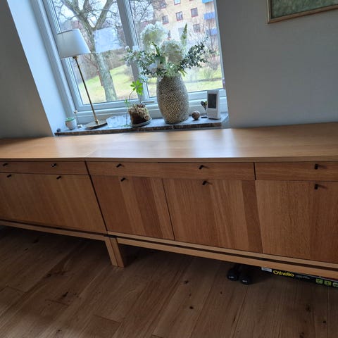 Använts som TV-bänk och därför borrat hål på baksidan för att kunna dra kablar