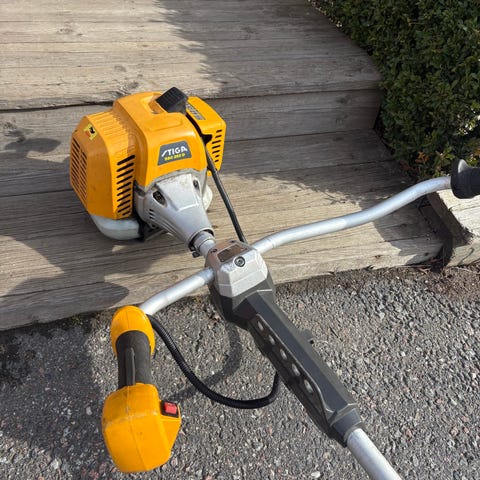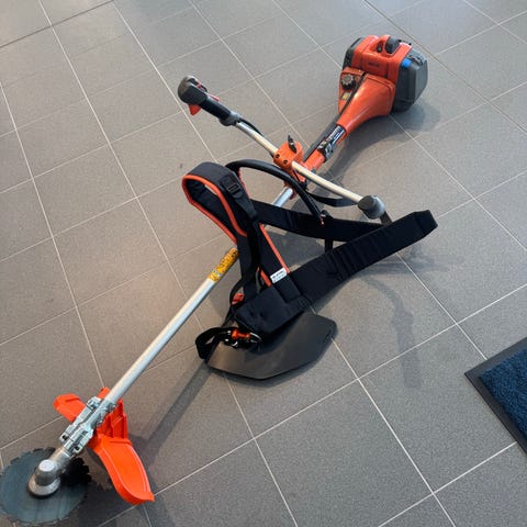 Husqvarna 343R röjsåg med bensinmotor. Modellen är utrustad med dubbelhandtag för bättre kontroll vid arbete i högt gräs och sly. Maskinen har orange kåpa och rak rigg med vinkelväxel för montering av trådhuvud eller klinga, beroende på behov. Passar för röjning av gräs, sly och lättare skogsarbete i trädgård och markområden.