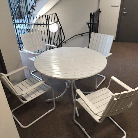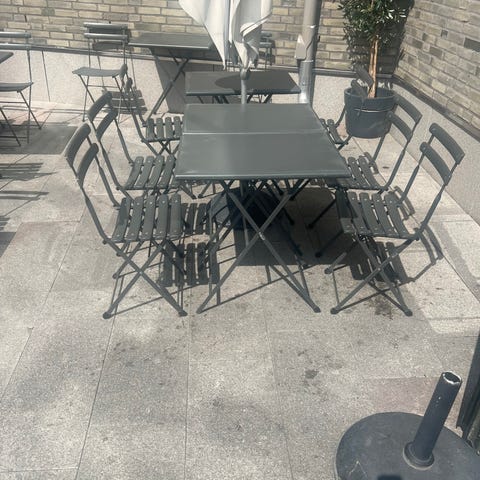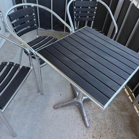 Italienska Nardi, stapelbar och hög kvalité och finish, även uv skyddad, nypris 2 stolar (den dyrare av dom med armstöd) och bord 3700;-. Detta är högkvalite för café och restaurang men passar perfekt för balkongen, trädgården, osv .. priset e 1400;- vilket är lågt så respektera det priset e fast tack. Finns i Upplands Väsby. Dom är använda 1 sommar och bra skick