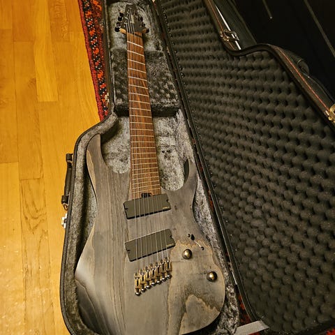 Säljer en Ibanez RG7321 från 2008. En riktigt stabil 7-strängad som passar perfekt för metal, prog och tyngre riff. Stallmicken är uppgraderad till en DiMarzio Tone Zone 7, vilket ger mycket tryck i botten och bra definition även vid lägre stämningar. Lack i bra skick men några mindre repor efter bälten och dylikt finns. Fast stall. Plastfilm fortfarande kvar på stämskruvar, plattan på baksidan och plattan över dragstångsskruven.