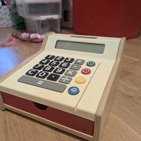 - Kassaapparat med tillhörande varukorg och pengar (använt skick)