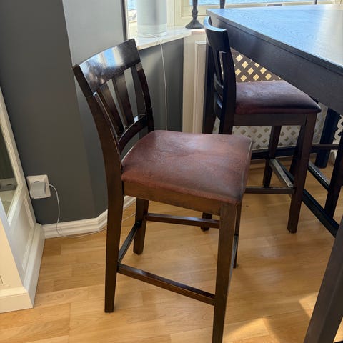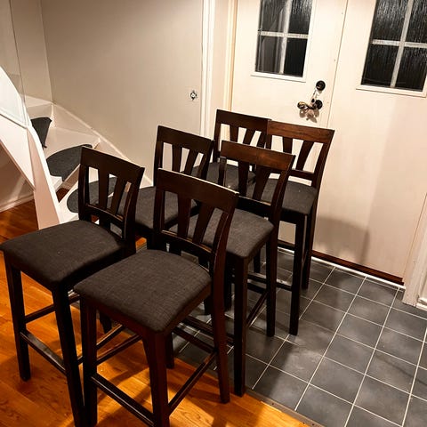 Säljer 4 stycken stadiga och bekväma barstolar. De är stabila och fungerar bra, men färgen har börjat skavas av på vissa ställen (se sista bilderna). Med lite kärlek eller ny färg kan de bli riktigt fina igen.