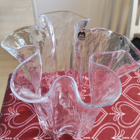 Vackert dekorativt ljusfat, i glas för tre st ljus. Designad av Pertti Kallioinen för Muurla Finland. 18,5 cm i diameter. I toppskick. Retro. Ljusstake. Ljus. Fat. Ljushållare.