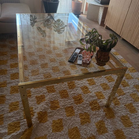 soffbord. Bordet har en kvadratisk bordsskiva i grön sten med markerad ådring och ett underrede i guld- eller mässingsfärgad metall. Passar som soffbord i vardagsrum eller lounge och ger en stabil yta för böcker, dekorationer och servering.