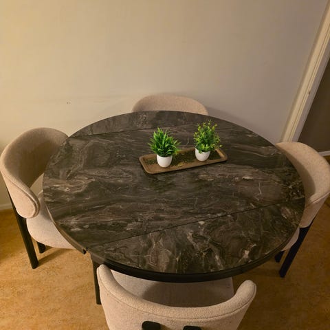 Matbord är utan iläggsskivor runt och 110cm i diameter. Med två iläggsskivor blir det ovalt upp till 210cm långt. Inga ringar eller fläckar, har alltid haft skyddsduk så bordsskivan är i mycket gott skick. Inte mycket märken på stolar och ben heller. En stolsrygg är dock lagad en gång så den har nog inte full styrka.