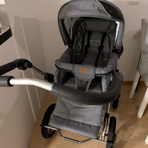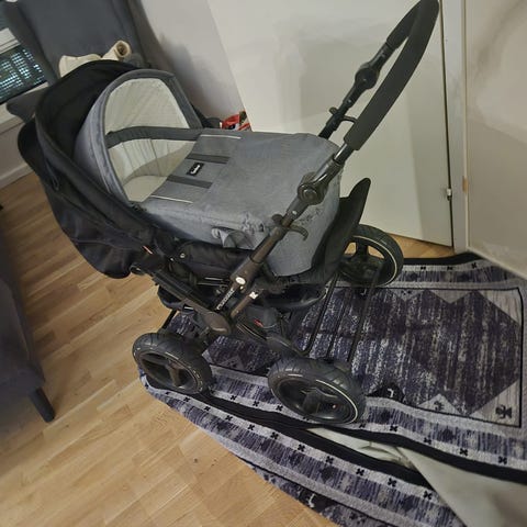 Emmaljunga med liggdel sittdel skötväska åkpåse kommer från djut och rök fri hem