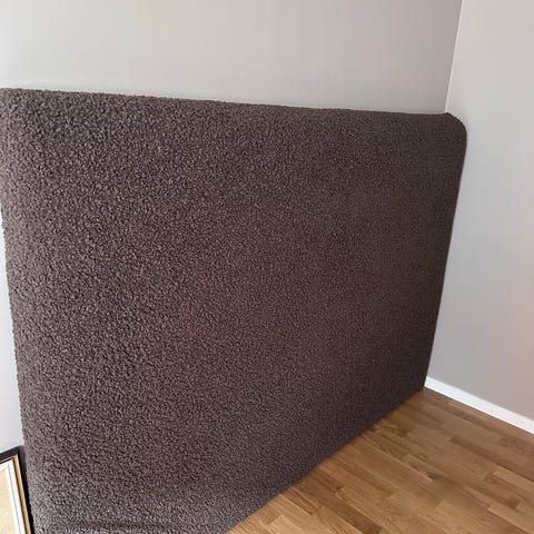 Sänggavel från Mio i beige textil med knappstoppad, vadderad framsida. Gaveln är använd och har tidigare suttit på en säng i storlek 180–200 cm. Den placeras bakom sängen och ger ett bekvämt stöd för rygg och kuddar samt blir en fin detalj i sovrummet.