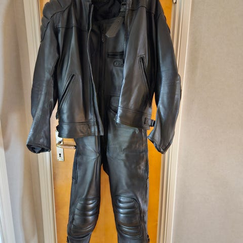 Tvådelat mc-ställ i skinn i svart färg. Består av skinnjacka och skinnbyxa som kan användas tillsammans som set. Jackan har dragkedja framtill och emblem på ärmarna. Byxorna har dragkedjor framtill vid benen. Avsett för motorcykelkörning med fokus på skydd och slitstyrka. Passar för den som söker ett komplett skinnställ för mc-bruk.