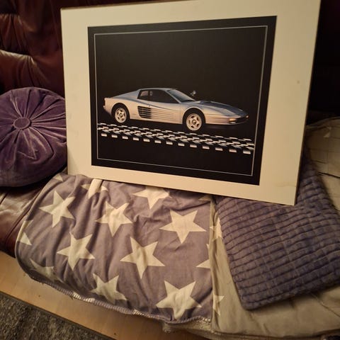 Konsttryck med motiv av en formelbil i rött utförande. Trycket är numrerat 3/100 och är signerat av konstnären i nedre kanten. Pappret har tydlig struktur som liknar akvarell- eller konstpapper. Passar som väggdekoration i hem, kontor eller hobbyrum med motorsporttema.