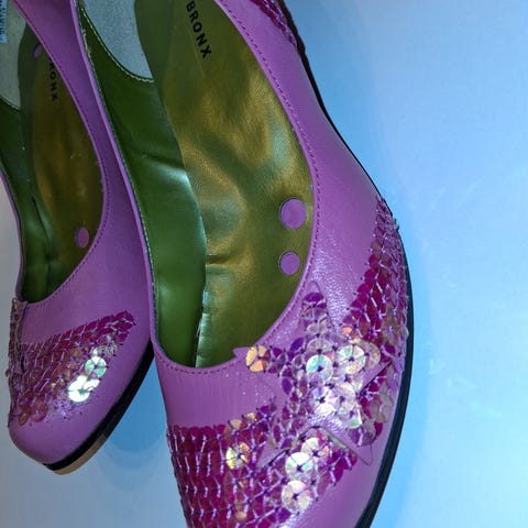 Säljer ett par klackskor i silvrigt ormskinnsimmitation.