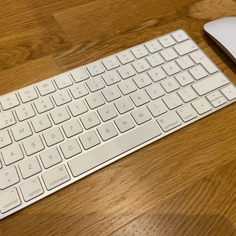 Apple Magic Keyboard och Magic Mouse 2. Tangentbordet är givetvis i svensk layout och musen är en Magic Mouse 2. Båda enheterna ansluts trådlöst via Bluetooth och funkar såklart till alla Apple datorer och även en del Windows.