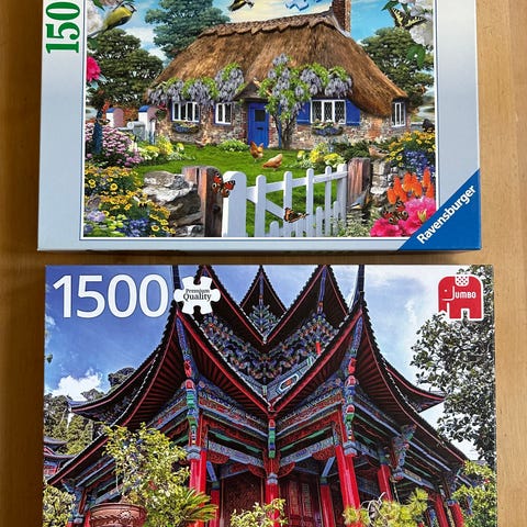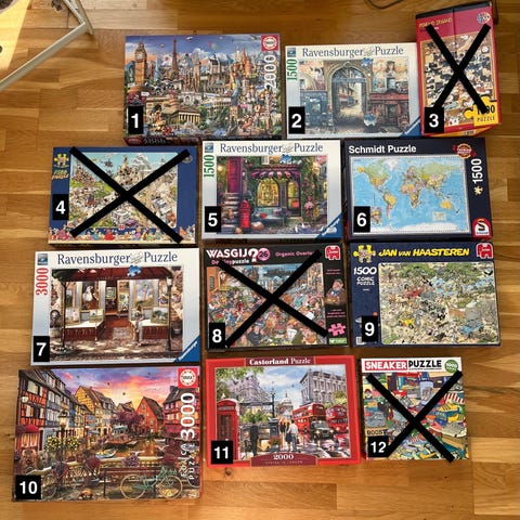 Blandning av pussel med olika motiv, bland annat djur, städer, landskap och julmotiv. Flera olika fabrikat och storlekar på pusslen, både mindre och större pussel. Passar för den som vill lägga varierade motiv med olika svårighetsgrad.