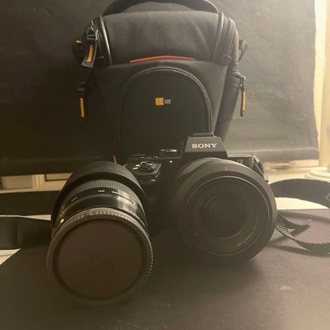 Sony A7 IV. Digital systemkamera med tillbehör.
