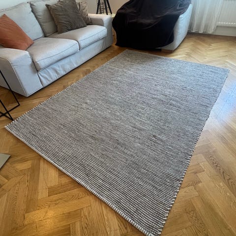 Mio matta i ljusgrå ton. Rektangulär modell som passar under soffgrupp eller matbord i vardagsrum eller liknande utrymmen. Neutralt mönster och färg som gör den enkel att kombinera med olika inredningsstilar.