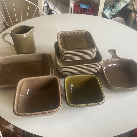 Deco Made in Sweden Helsingborg keramik assietter mindre är 18x18 cm, (4 st) pris :200kr. Stora 22,5 x22,5 cm. (4st) pris:200kr ..Fyrkantig form med lätt rundade hörn och dekorerad kant. Set om fyra assietter, lämpliga för servering av förrätter, efterrätter eller mindre rätter. Märkta undertill med modellbeteckning L355 och tillverkade i Sverige. Kan förekomma nån liten nagg, för de har några år på nacken. Finns i Örebro och hämtas här.