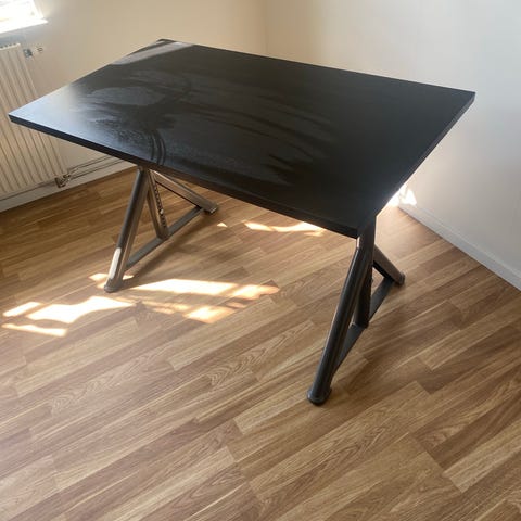 Superbra gamingbord med plats för två skärmar, kabelgömma under bordet på baksidan, heltäckande löstagbar matta för att slippa musmatta. Matt svart, tungt och stabilt bord.
