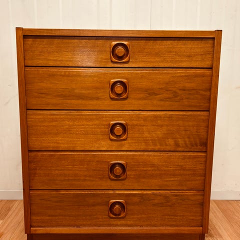 Säljer en snygg byrå i teak med fyra rymliga lådor. Klassisk skandinavisk design med fina runda handtag och vacker träådring.