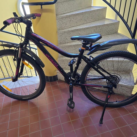 Mountainbike MERIDA 26", ramstorlek 42 cm, 24-växlar, hydrauliska bromsar fram och bak. Cykeln är nyservad servad och jag har bytt kedja, fram drev (vevparti) och handtag. Cykeln är ok skick och allt fungerar som den ska förutom att dämparen har låsts!