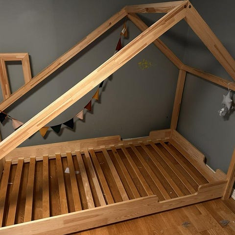 Sängen är stabil i trä och har skyddsräcken runt om. Den öppna husformen gör att man enkelt kan dekorera med t.ex. ljusslinga, tyg eller vimplar.