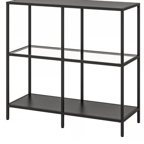 IKEA hylla i vit metall med tre hyllplan. Öppen konstruktion som passar för förvaring av böcker, lådor eller dekoration i vardagsrum, hall eller kontor. Eller som tevebänk. Från IKEA med en glasskiva i mitten av tevebänken.