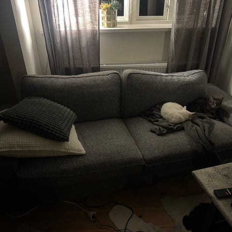Stor grå soffa. Sparsamt använd katt finns i huset