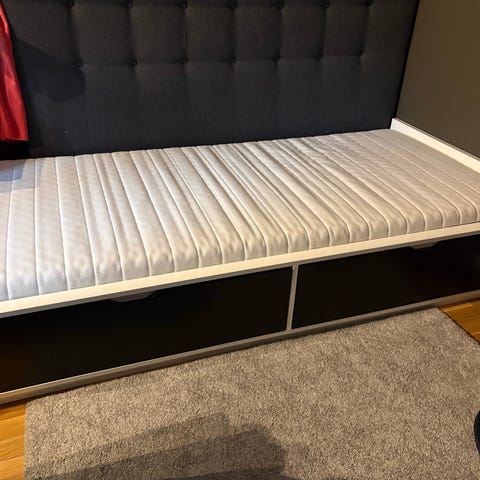 Säng från Ikea av serien Släkt med utdragbar extrasäng. Sängen har två utdragslådor undertill som ger extra förvaringsutrymme. Passar som enkelsäng i sovrum, gästrum eller barnrum. Madrass och ribbotten ingår. Mått: 200 x 90 cm.