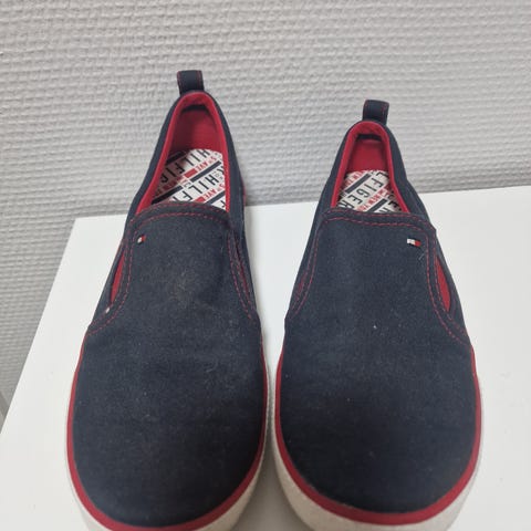 Tommy Hilfiger loafers och seglarskor i storlek 38. Skorna har ovandel i vitt med blå partier och dekorativa röda sömmar.