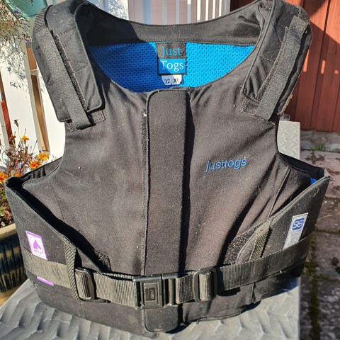 Jacson Safety skyddsväst i svart färg. Västen har vadderade paneler runt om för stötdämpning och skydd. Den stängs med dragkedja och överlappande framstycke. Märkt med CE enligt direktiv 89/686/EEC. Storleksangivelser på etikett visar måttintervall för bröst, midja och höft enligt illustrationen. Lämplig som skyddsutrustning vid exempelvis ridning eller annan aktivitet där extra kroppsskydd behövs.