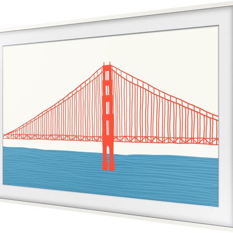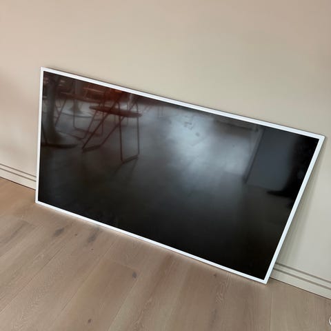 Samsung The Frame TV i svart utförande. Modellen är utformad för att fungera både som TV och som ramad bildskärm när den inte används, med en design som liknar en tavla. Skärmen är platt med smal ram. Bilden visar funktioner som reflexionsskydd, 144 Hz uppdateringsfrekvens, automatisk 4K-uppskalning samt Quantum HDR och HDR10+. Lämplig för väggmontering eller placering på TV-bänk i vardagsrum eller sovrum.