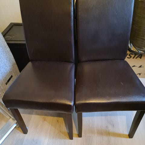 Stolar i trä med stoppad sits i grön textilklädsel. Rak rygg med bred ryggbricka och lätt vinklade bakben. Passar som matstolar eller extra sittplatser i exempelvis kök eller vardagsrum.
