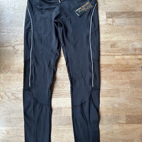 Säljer ett par svarta sportleggings med hög midja och grå reflexdetaljer längs benen. Insidan av benen har ett mönstrat tyg med loggor och extra grepp. Perfekta för ridning Materialet är stretchigt och följsamt. några hål å så som jag har sytt ihop, haft de rätt länge nu men slutat med ridning
