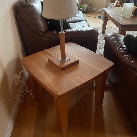 Robust soffbord i massiv ek med lite rundad kant. Det finns ett mindre matchande soffbord i separat annons.