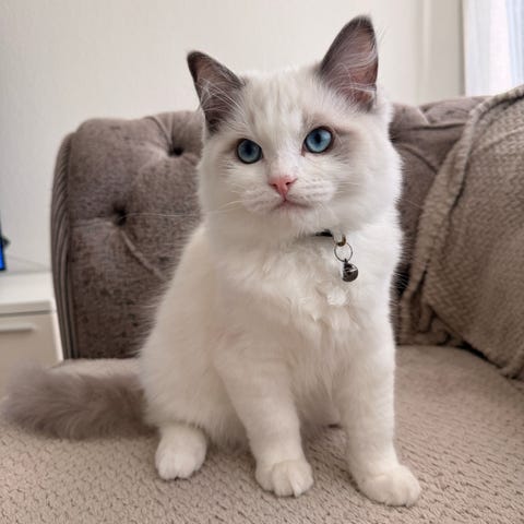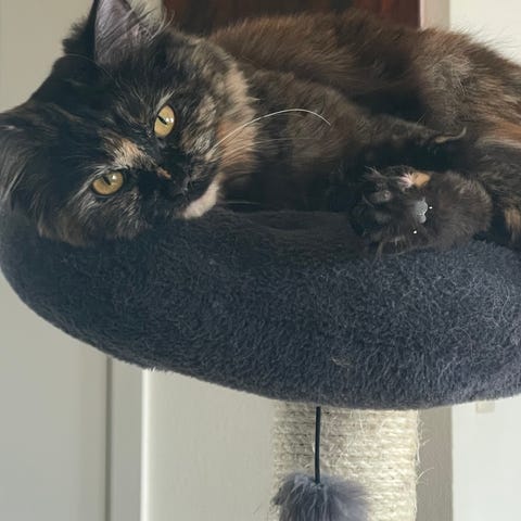 Hon är busig och tillgiven. Fungerar bra med andra katter och barn och vill alltid vara med när det händer något eller ligga nära och kela. Väldigt nyfiken.