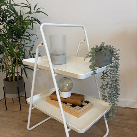 Sidobord på hjul med 1 låda och 3 öppna fack.